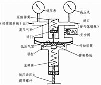 使用時先打開鋼瓶總開關,然后順時針轉動低壓表壓力調節螺桿,使其壓縮主彈簧并傳動薄膜、彈簧墊塊和頂桿兒將活門打開。這樣進口的高壓氣體由高壓室經節流減壓后進入低壓室,并經出口通往工作系統。轉動調節螺桿,改變活門開啟的高度,從而調節高壓氣體的通過量并達到所需的減壓壓力。